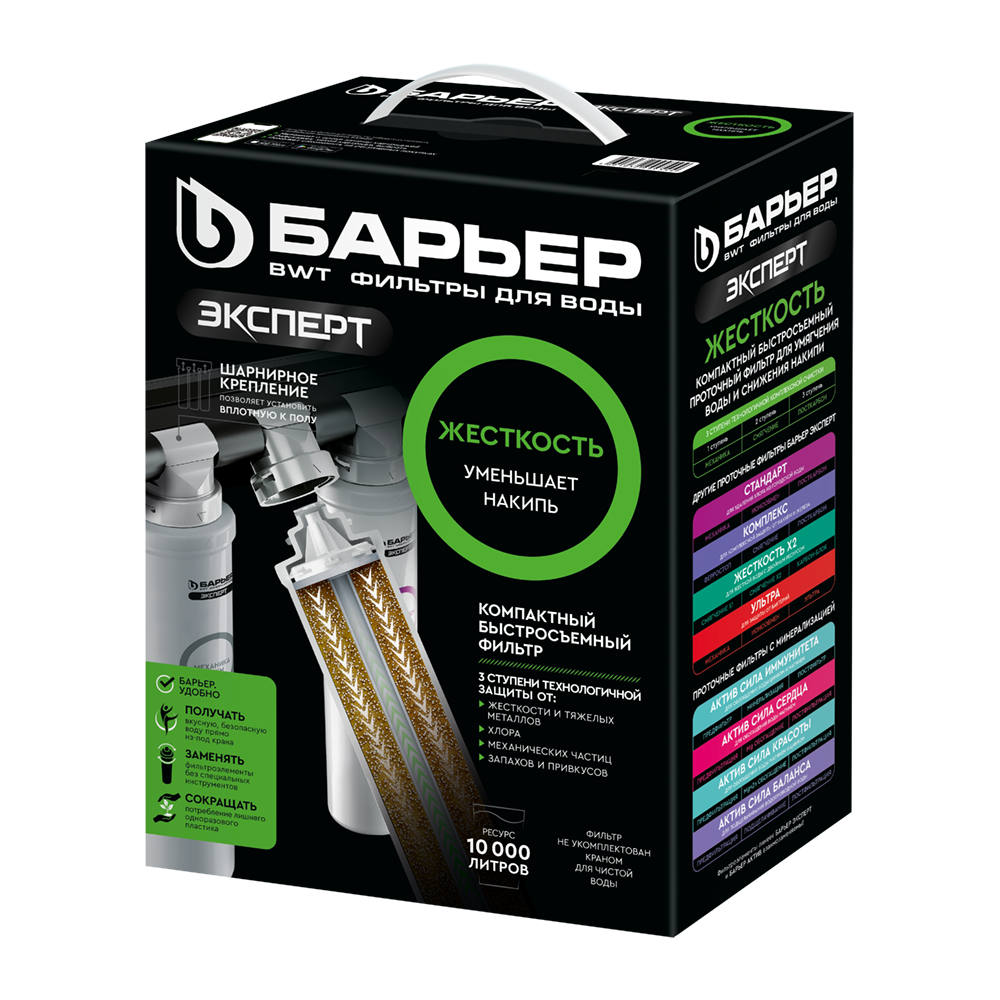 3."БАРЬЕР ЭКСПЕРТ ПостКарбон" - финишная очистка и кондиционирование, устранение неприятных привкусов и остаточного хлора. Ресурс 10 000 литров.